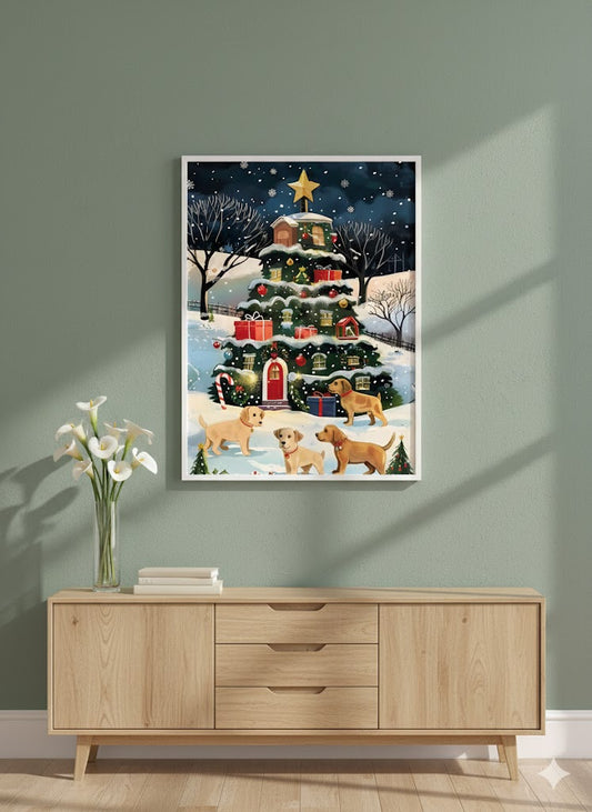 Framed Christmas Tree Canvas Print — Festive Holiday Scene with Puppies